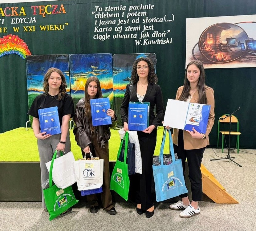 Z przyjemnością informujemy, że uczennice naszej szkoły zostały laureatkami jubileuszowej XXVI edycji Wojewódzkiego Konkursu „Podkarpacka Tęcza”, która odbyła się 16 kwietnia 2026 r. w Zespole Szkół Zawodowych im. Kardynała Stefana Wyszyńskiego w Dynowie. Tegoroczny konkurs przebiegał pod hasłem „Podkarpacie w XXI wieku”